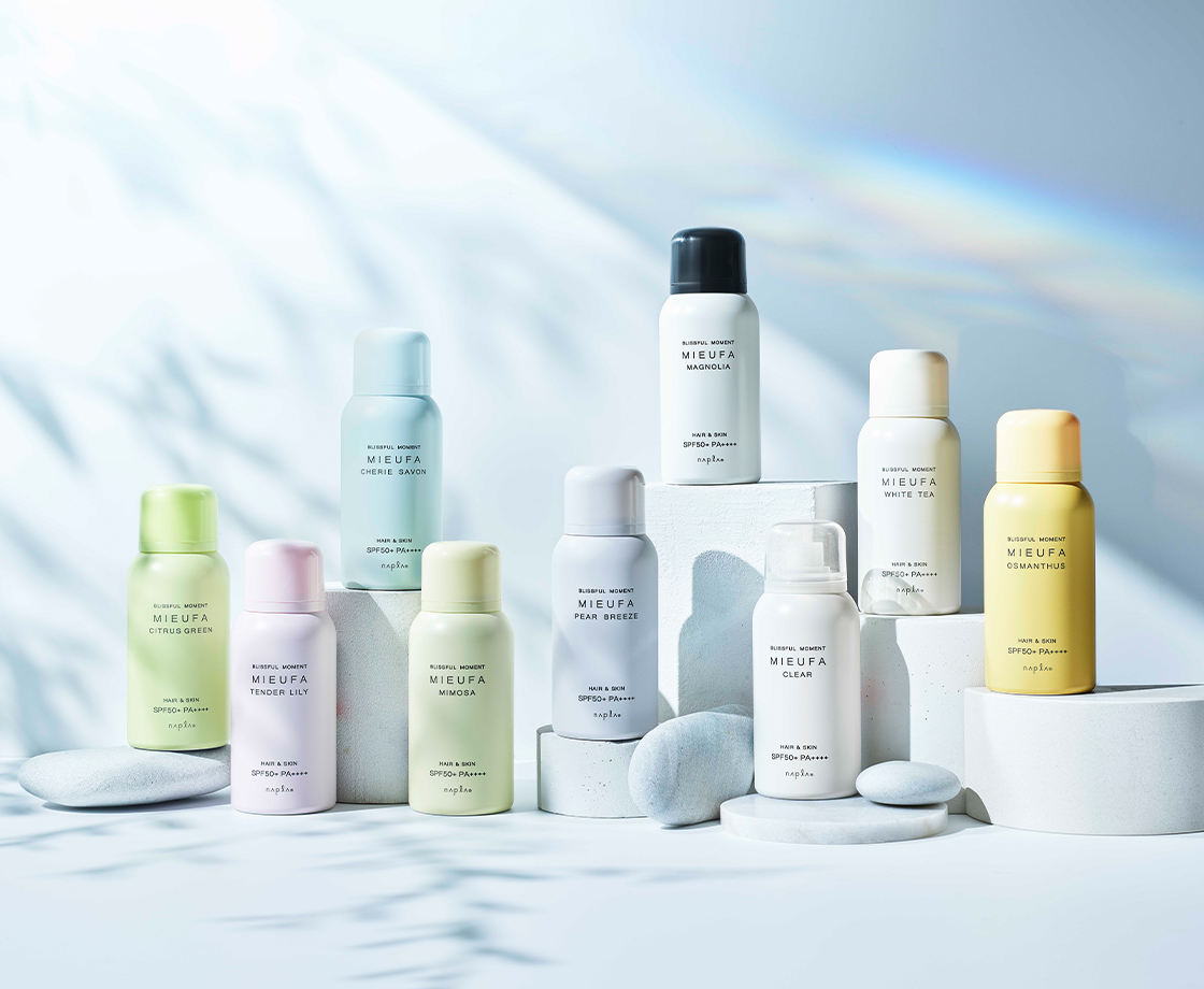 香りとケアにこだわったUVケアスプレー「MIEUFA」。8種類の香りと、無香料の全9種類からお選びいただけます。SPF50+ / PA++++で紫外線から髪と肌をしっかり守ります。